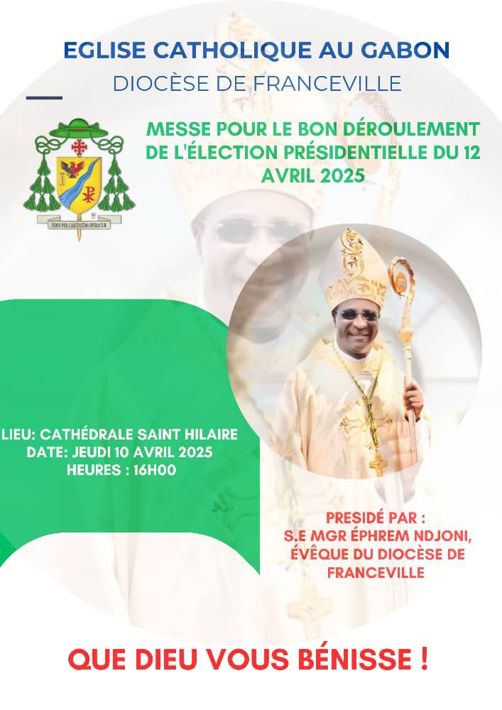 A deux jours du rendez-vous électoral, le samedi 12 avril 2025, Son Excellence Mgr Ephrem DJONI, évêque de Franceville présidera une une messe au cours de laquelle, les fidèles vont prier pour le bon déroulement de cette élection présidentielle au Gabon, le jeudi 10 avril 2025 à 16h, à la cathédrale Saint Hilaire.