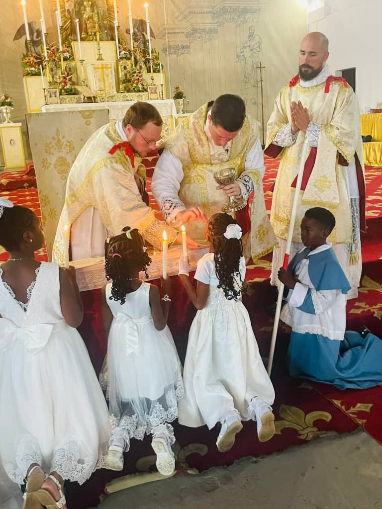 Dans une liturgie toute solennelle le dimanche de la sainte Trinité le Chanoine Bertrand BERGEROT a presidé à la paroisse dont il a la charge une messe au cours de laquelle il a donné la première communion à plusieurs jeunes.La fin de cette eucharistie a connu une procession du saint sacrement qui a vue une immense participation des fidèles paroissiens.