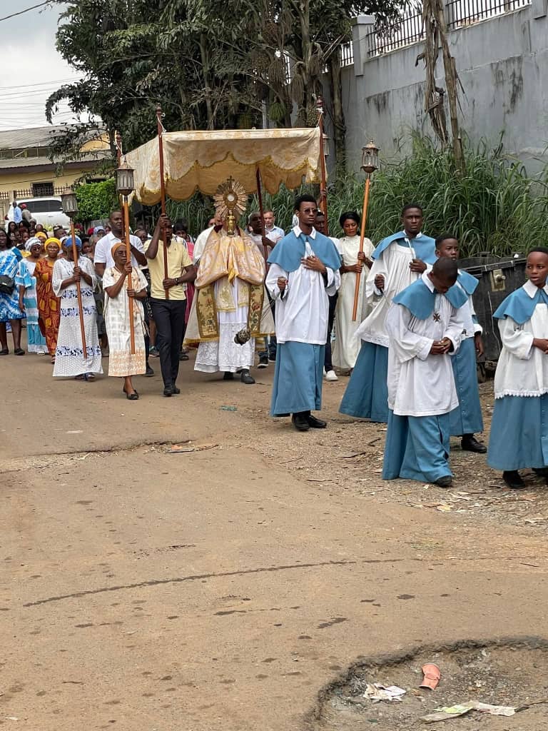 Le saint sacrement était porté sous un dé. Somme toute, Jésus eucharistie qui est le pain de vie a été célébré, loué, porté en procession et adoré. Qu’il soit loué!