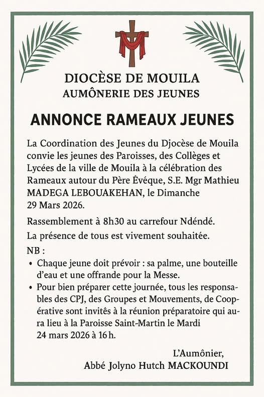 La coordination diocésaine des jeunes du diocèse de Mouila organise le dimanche 29 mars 2026 dans les rues de la ville de Mouila, les Rameaux des jeunes. Cet événement spirituel majeur est placé sous la présidence de Son Excellence Mgr Mathieu MADEGA LEBOUAKEHAN, évêque du diocèse de Mouila.