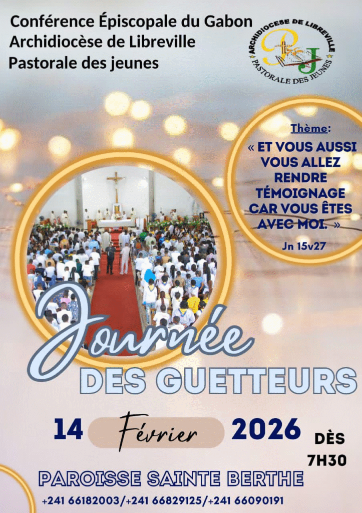 L’aumônier de la Commission diocésaine des jeunes de l’archidiocèse de Libreville, l’abbé Michaël OYONO MOUSSAVOU, curé de la paroisse Saint-Pierre, invite tous les jeunes de l’archidiocèse de Libreville à prendre une part active à la Journée des Guetteurs qui aura lieu le samedi 14 février 2026 dès 7 h 30 à la paroisse Sainte-Berthe à Essassa.