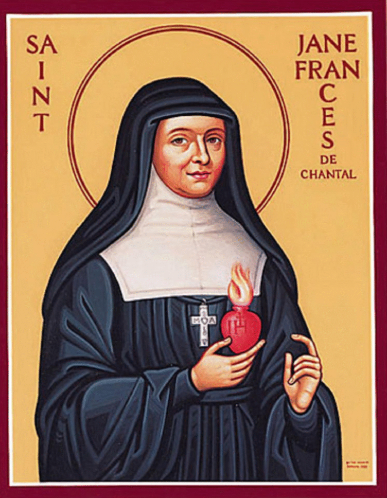 Jeanne de Chantal , née Frémyot était la fille du président du Parlement de Bourgogne. C’était un catholique intransigeant en cette époque des Guerres de religion. A 20 ans, elle épouse le baron de Chantal qu’elle aima d’un grand amour. Epouse accomplie, pieuse à ses heures, elle était une mère parfaite qui eut la douleur de perdre en bas âge deux de ses six enfants. Elle a 28 ans quand le baron est tué d’un accident de chasse. Veuve, elle se révolte, déteste le malheureux meurtrier malgré lui et, au bord du désespoir, elle s’en remet à un confesseur rigoureux. Quatre ans plus tard, elle entend saint François de Sales prêcher un carême et, en remarquant sa douceur, elle reconnaît en lui le maître spirituel dont elle a besoin. L’évêque de Genève la libère de ses scrupules, et de leur confiance réciproque va naître une grande aventure religieuse et spirituelle. Jeanne-Françoise prend le temps d’établir ses quatre enfants dans la vie et fonde l’Ordre de la Visitation – Sainte-Marie, congrégation destinée aux femmes de santé fragile. Après la mort de saint François de Sales, elle maintiendra intacte cette spiritualité salésienne. Pendant 40 ans, elle souffrira de tentations contre la foi, mais l’amour de Dieu lui suffit, qu’elle rejoindra en 1641.